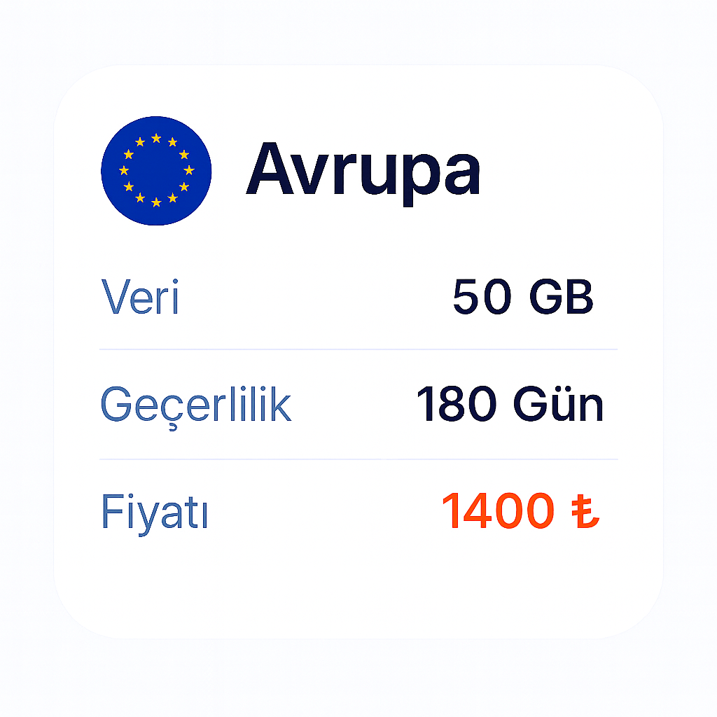 50Gb 180Gün 38 Ülkede Geçerli eSIM internet paketi